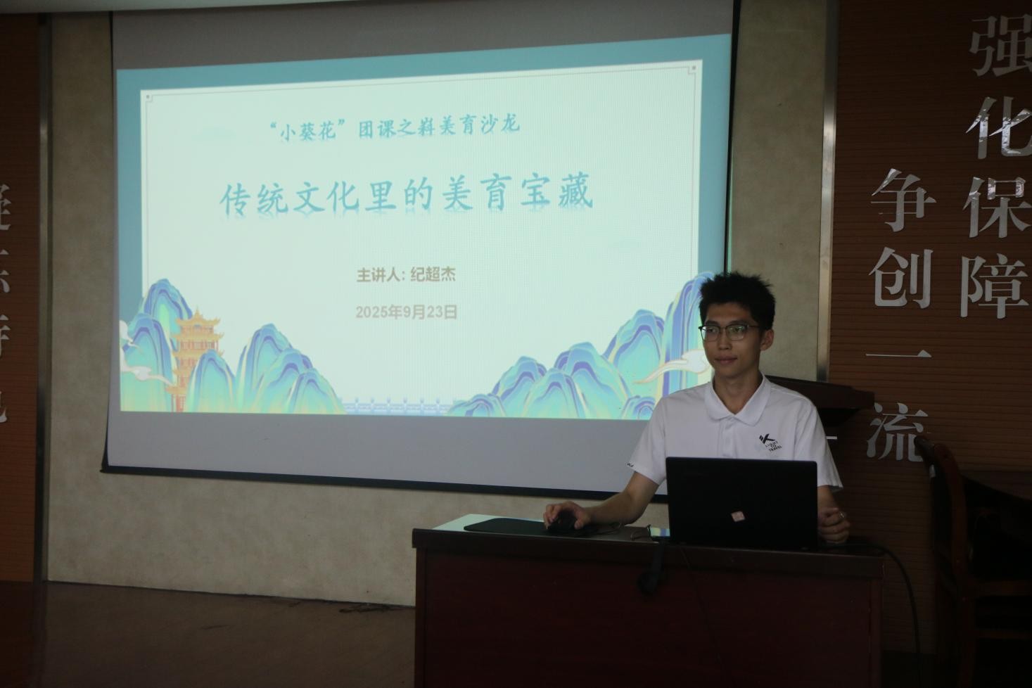 2025年9月23日,suncitygroup太阳新城“小葵花”主题团课之嵙美育沙龙在J2-104开班,作为该系列主题团课的第一讲,此次课程的主题是“传统文化里的美育宝藏”,由学生会执行主席纪超杰主讲,全体学生会成员参加。