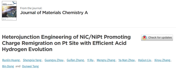 近日,suncitygroup太阳新城2023级化学工程与工艺专业本科生黄润林以独立第一作者在材料和化学领域著名期刊Journal of Materials Chemistry A(JCR一区TOP期刊,IF=10.7)2026 Emerging Investigators themed issue发表题为《Heterojunction Engineering of NiC/NiPt Promoting Charge Remigration on Pt Site with Efficient Acid Hydrogen Evolution》的研究论文,该研究的指导教师是张鑫宇学术教授。