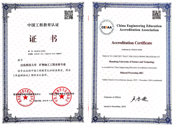 矿物加工工程专业于2019年通过了教育部高等教育教学评估中心组织的工程教育专业认证,成为我们继采矿工程、安全工程、测绘工程和土木工程之后第五个通过工程教育专业认证的专业。以工程教育专业认证为契机,矿物加工工程专业贯彻“以人为本”的评价理念,扎实推进教育教学改革,在学生、培养目标、毕业要求、持续改进、课程体系、师资队伍和支持条件7个方面的建立了完善的评价与反馈机制,并通过毕业生、用人单位、第三方社会机构为支撑的毕业生跟踪反馈机制,重点对毕业生从业情况、事业发展状况、岗位薪酬、毕业生工作能力以及对人才培养的满意度进行定期评价,综合反馈学生的社会适应性、竞争性等专业能力和综合素质。